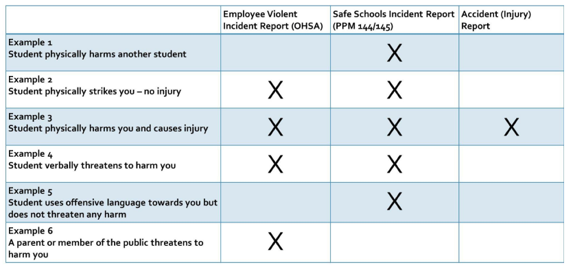 ** If a student has caused you to bleed, broken skin, spat on you, bit you, or you have come into contact with bodily fluids – YOU also need to complete a WSIB exposure form Worker’s exposure incident form (PEIR) (wsib.ca) (this incident would be VIR, Exposure form, parklane and Safe Schools form)