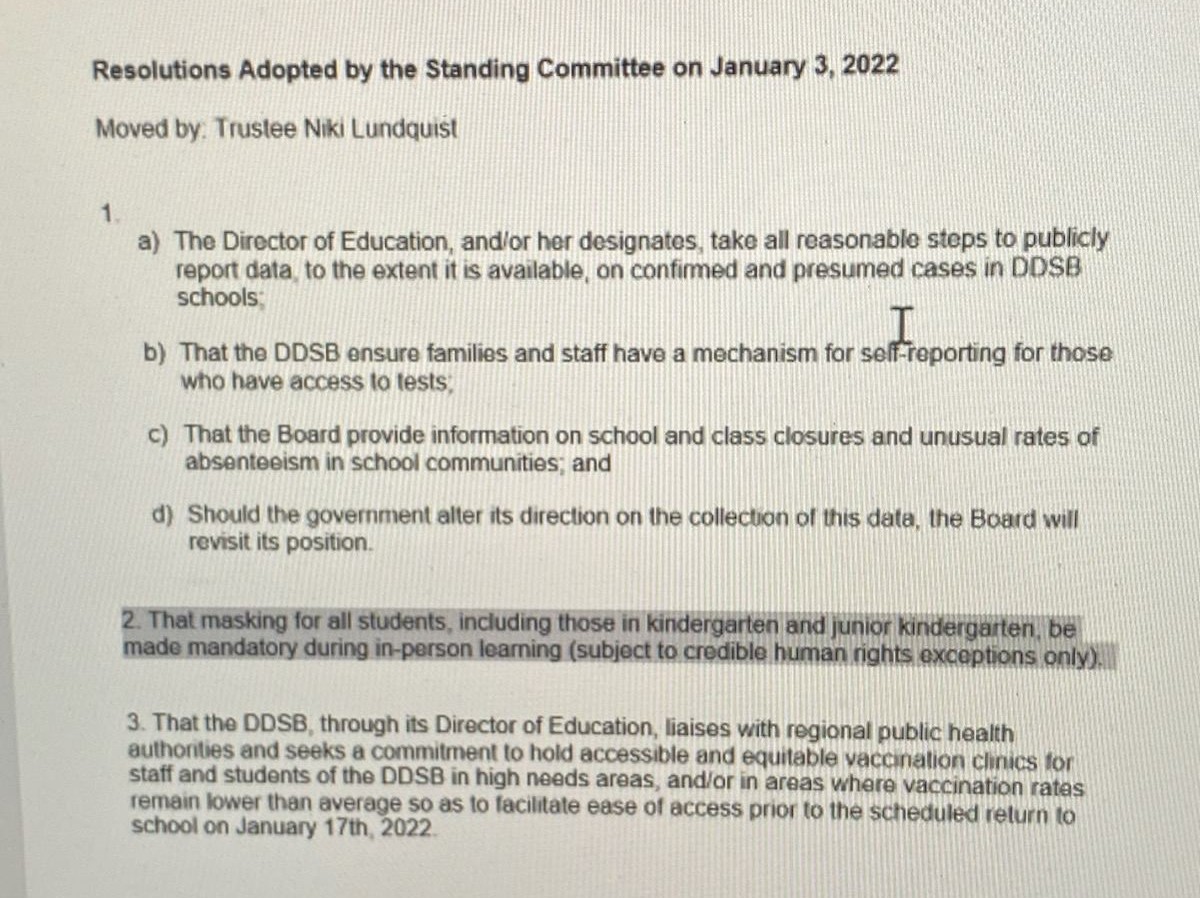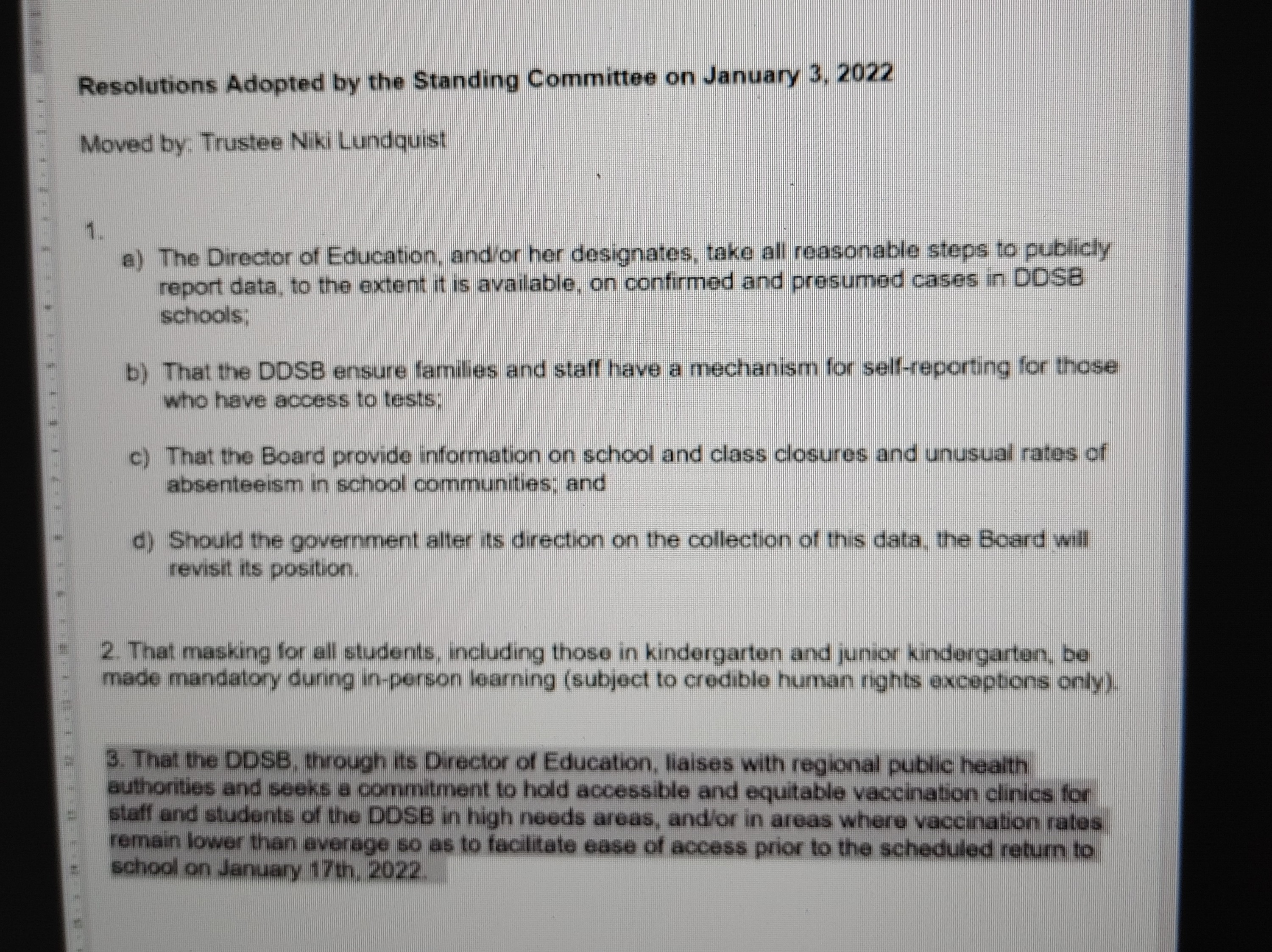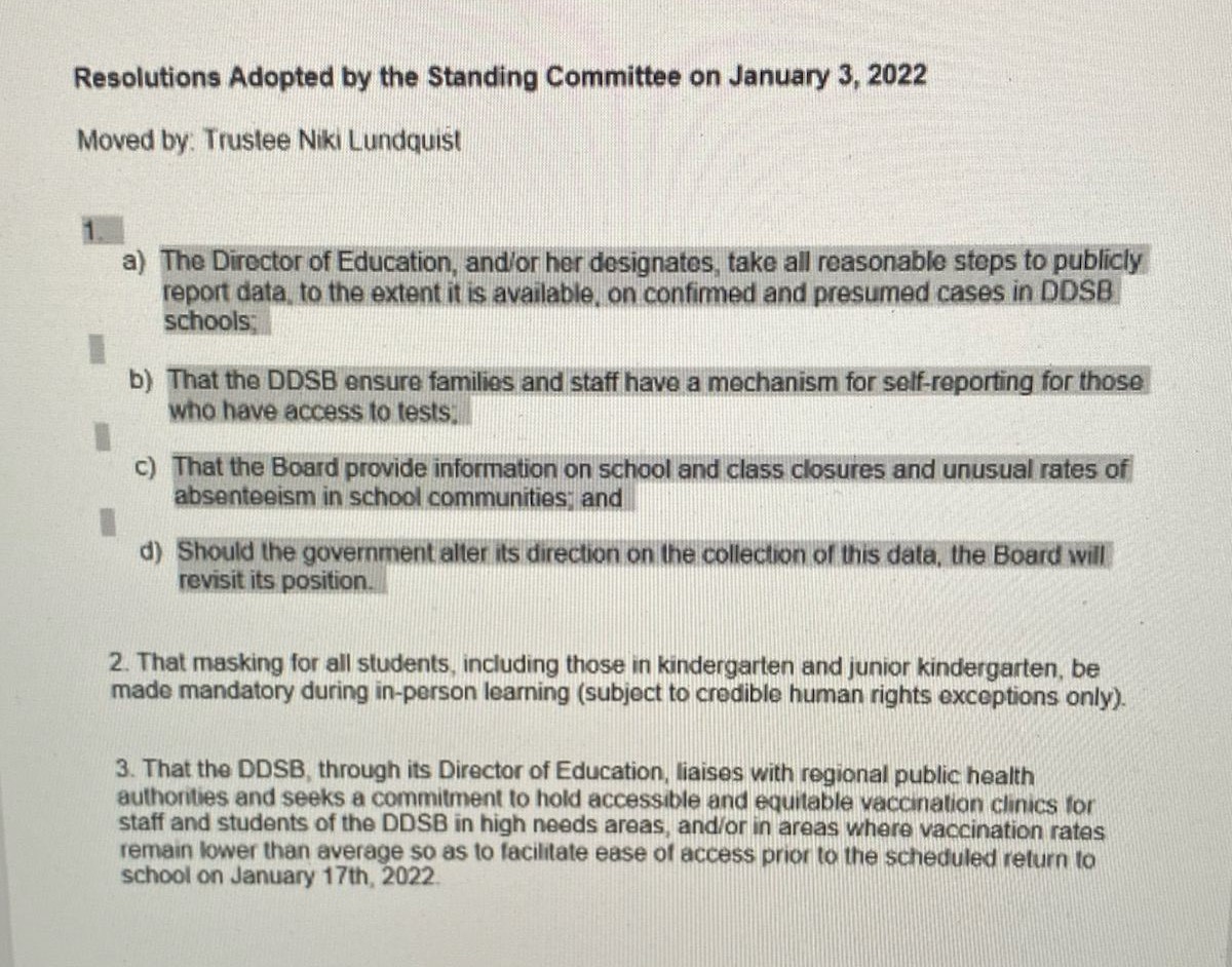 At a special meeting of the DDSB these motions have passed. Some with the combined efforts of CUPE, ETFO and other Local Unions to continue to work towards and achieve the best H&S and information sharing for staff and students. Additional motions are forthcoming.